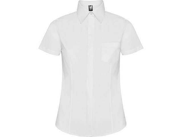 Рубашка женская прилегающего силуэта с вытачками на полочке и спинке с коротким рукавом. Накладной карман на груди слева, закругленный низ изделия. Планка с потайными пуговицами.