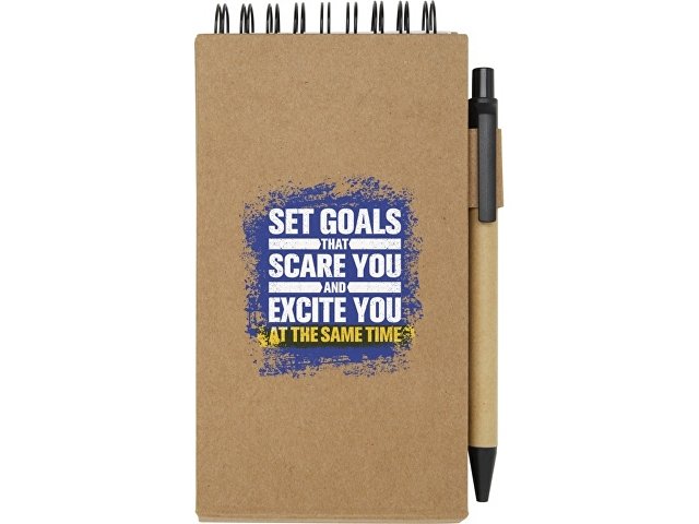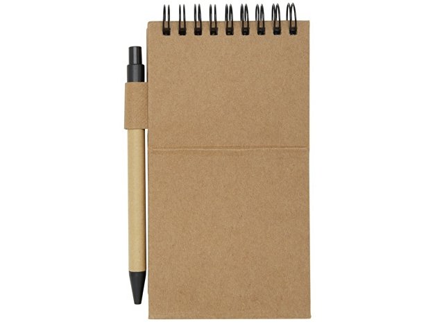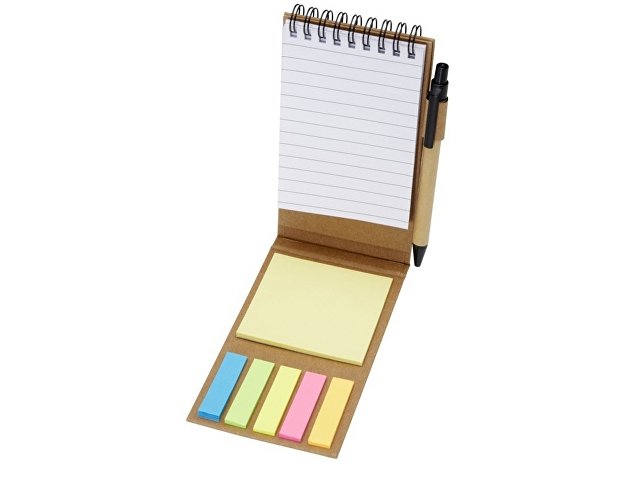 Липкий блокнот с шариковой ручкой. В блокноте 30 листов белой линованной бумаги плотностью 70 г/м2 (8 x 12 см). В комплект также входят 25 разноцветных (5 x 1,2 см) и 25 желтых (7,5 x 7,5 см) клейких листочков, оба типа на бумаге плотностью 70 г/м2. Корпус шариковой ручки изготовлен из переработанной бумаги. Цвет чернил: черный. Длина непрерывной линии: 1000 метров. Размер пера: 1,00 мм.