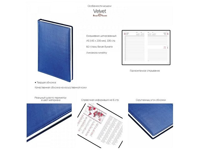 Недатированный ежедневник A5 «Velvet» в линейку от бренда Bruno Visconti - это качественный корпоративный подарок по выгодной цене, произведенный специально под персонализацию. Представлен в универсальном формате А5. В нем есть полезная справочная информация и телефонная книга, а также 272 страницы для записи идей, мыслей и составления рабочих планов.